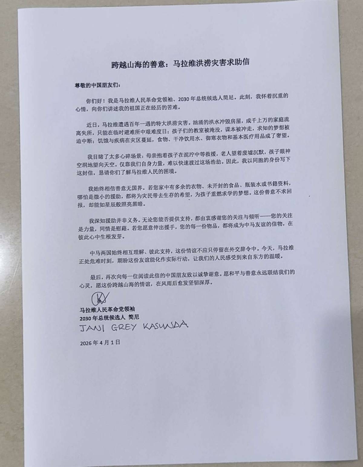 近日,马拉维遭遇百年一遇的特大洪涝灾害,造成严重人员流离失所和基础设施损毁。马拉维人民革命党领袖、2030年总统候选人Jani Grey Kasunda向中国社会发出公开求助信,呼吁国际社会关注灾情并提供人道援助。